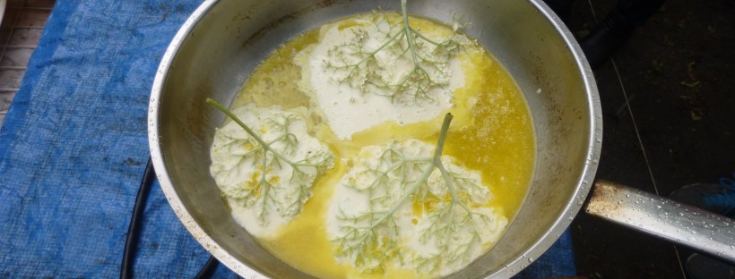 Da die SchülerInnen und die Lehrer auch mal eine Pause brauchten haben wir Pfannkuchen mit frischen Holunderblüten gebacken. Dazu haben sie einen ganz normalen Pfannkuchen Teig gemacht und die Holunderblüten in den Teig getaucht. Dann haben sie die ganze Pflanze inklusive Teig in der Pfanne angebraten.