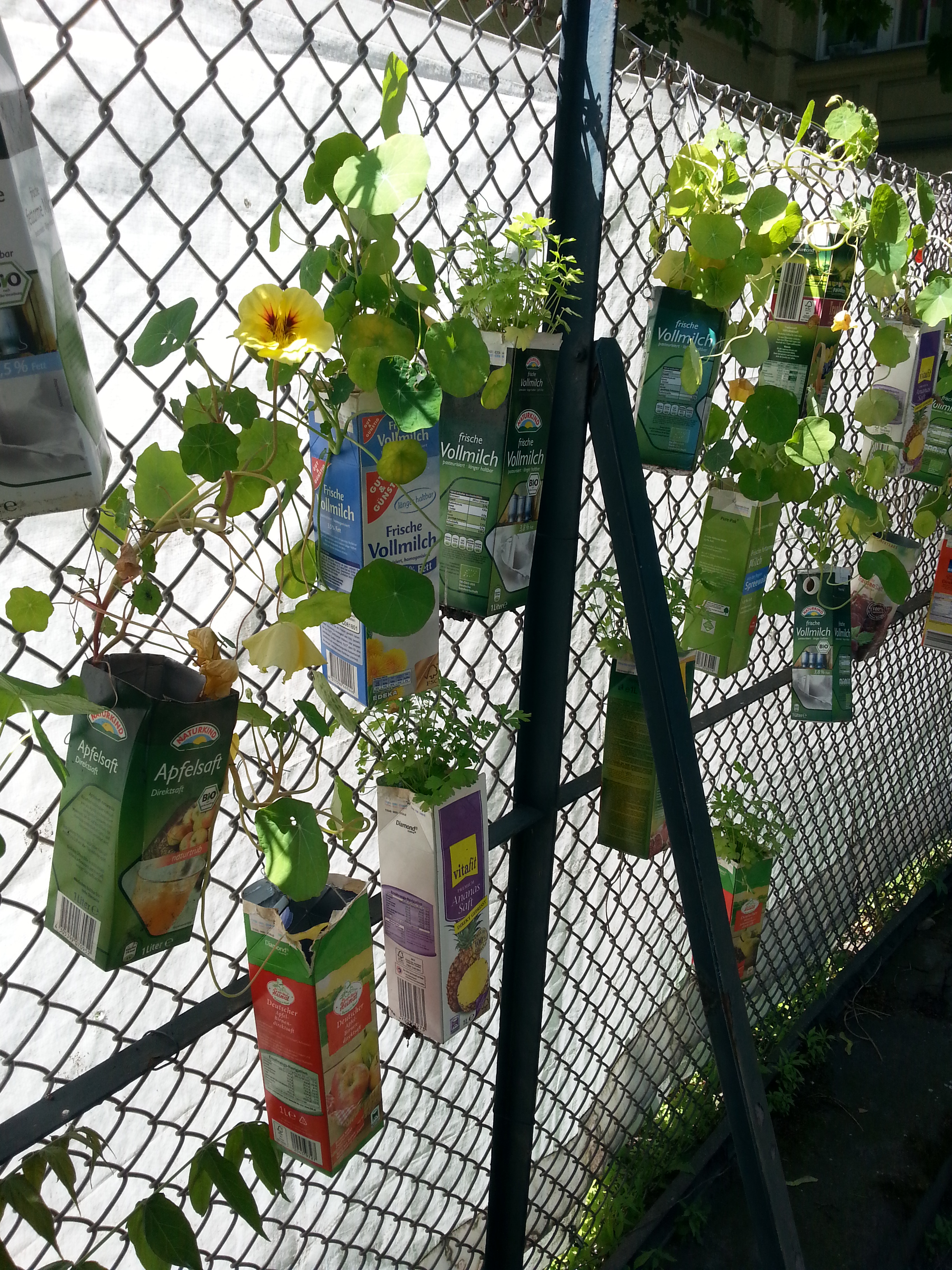 Um im Unterricht des WAT Bereichs auch mit frischen Kräutern und Salaten zu kochen, haben die SchülerInnen frische Petersilie und Kapuzienerkresse gepflanzt. Dazu haben einige Schülerinnen die Pflänzchen schon vorgezogen. Dannach haben es Einige übernommen die vorgesetzten Pflanzen in die dafür vorgesammelten Tetra Paks anzupflanzen. Um die Pflanzen vor Wind und Kälte zu schützen wurden sie in Plastikzelten untergestellt. Gestern haben wir die Tetra Paks mit Draht am Zaun befestigt. Nun ist der Zaun blickdicht und sieht bald schön bunt aus.