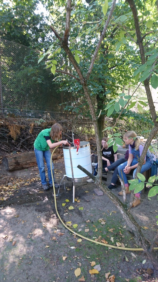 Das praktische Bienenjahr ist zu Ende – im Oktober stand der Umzug in unseren neuen Raum an. Nun sind wir nicht mehr in einem provisorischen Container, sondern in einem festen Raum im Erdgeschoss des Schulgebäudes untergebracht, und ein Wasseranschluss erlaubt es uns, dort auch gleich Honig zu ernten und zu verarbeiten. Das ist eine deutliche Verbesserung gegenüber dem bisherigen Standort in der Schulküche im 5. Stock, bei dem die Waben umständlich transportiert werden mussten…