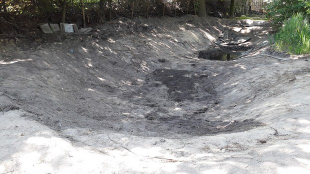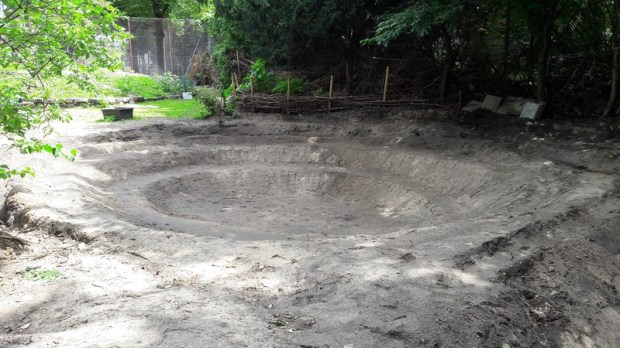 Im Verlauf dieser Wochen wurde mir klar, dass der Teich verkleinert werden musste, um alle Arbeiten zu schaffen und eine ausreichende Pflege zu gewährleisten. Da der Teich in der Mitte eine Aufschüttung hatte, bot es sich an, diese zu nutzen und die Verkleinerung hier vorzunehmen. Außerdem entschieden wir uns, den vorderen Teil der beiden Kuhlen als zukünftigen Teich zu nutzen, da hier mehr Sonne einfällt (wichtig für spätere Unterwasserpflanzen) und auch weniger Laubfall von den umliegenden Bäumen kommt. Aus diesem Grunde konzentrierten wir uns vorwiegend um die Ausarbeitung am vorderen Teil.