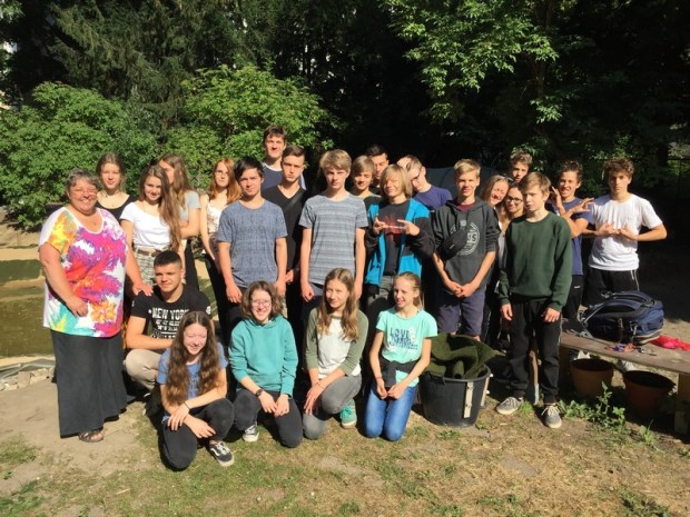 Was klein und unscheinbar anfing, weitete sich zu einem Riesenprojekt aus. Ebenso war es mit den Schülern. Angefangen habe ich mit 10 AG-Schülern des 7. Jahrganges. Im Verlauf des Projekts wuchs auch die Zahl der Schüler. So kamen zunächst meine 7.Klässler aus der Biologie hinzu, dann meine Chemie-8.Klässler im Rahmen der UE Wasser, alle Klassen, die je bei mir Vertretung hatten, die Willkommensschüler der WKA I, als Gelegenheitshilfen meine 9.Klässler und als wesentliche Stütze in den letzten vier Wochen meine Chemie-10.Klässler im Rahmen der UE Kunststoffe. Meine 10.Klässler waren es auch, die als Kunststoffexperten die Auswahl der Teichfolie trafen, das Teichprofil ausmaßen, die Berechnungen des Folienmaßes vornahmen, auf deren Grundlage die Bestellungen erst erfolgen konnten und die die Projekttage rockten. Nicht zu vergessen sind auch der Trupp Jungen aus der 9. Klasse, die mir die Bude einrannten, um ja bei den Projekttagen dabei zu sein und die Jungs der 10. Klasse WAT und Sand und Erde transportierten, schippten, stampften was das Zeug hielt. Während der Projekttage versorgte uns die WKA I mit kulinarischen Köstlichkeiten.