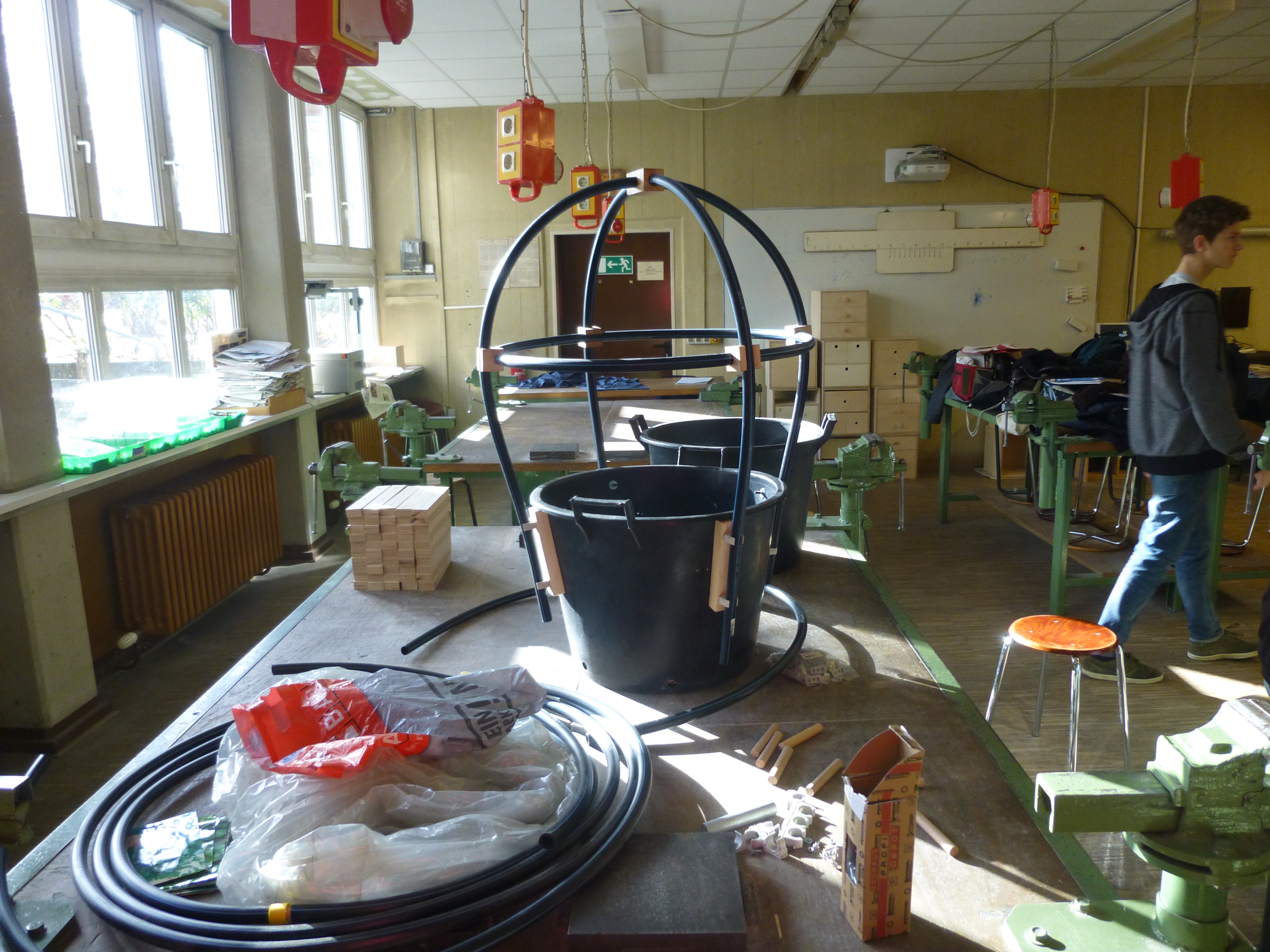 - Als erstes haben wir die Materialien zusammengesucht und die Plastikeimer vermessen.