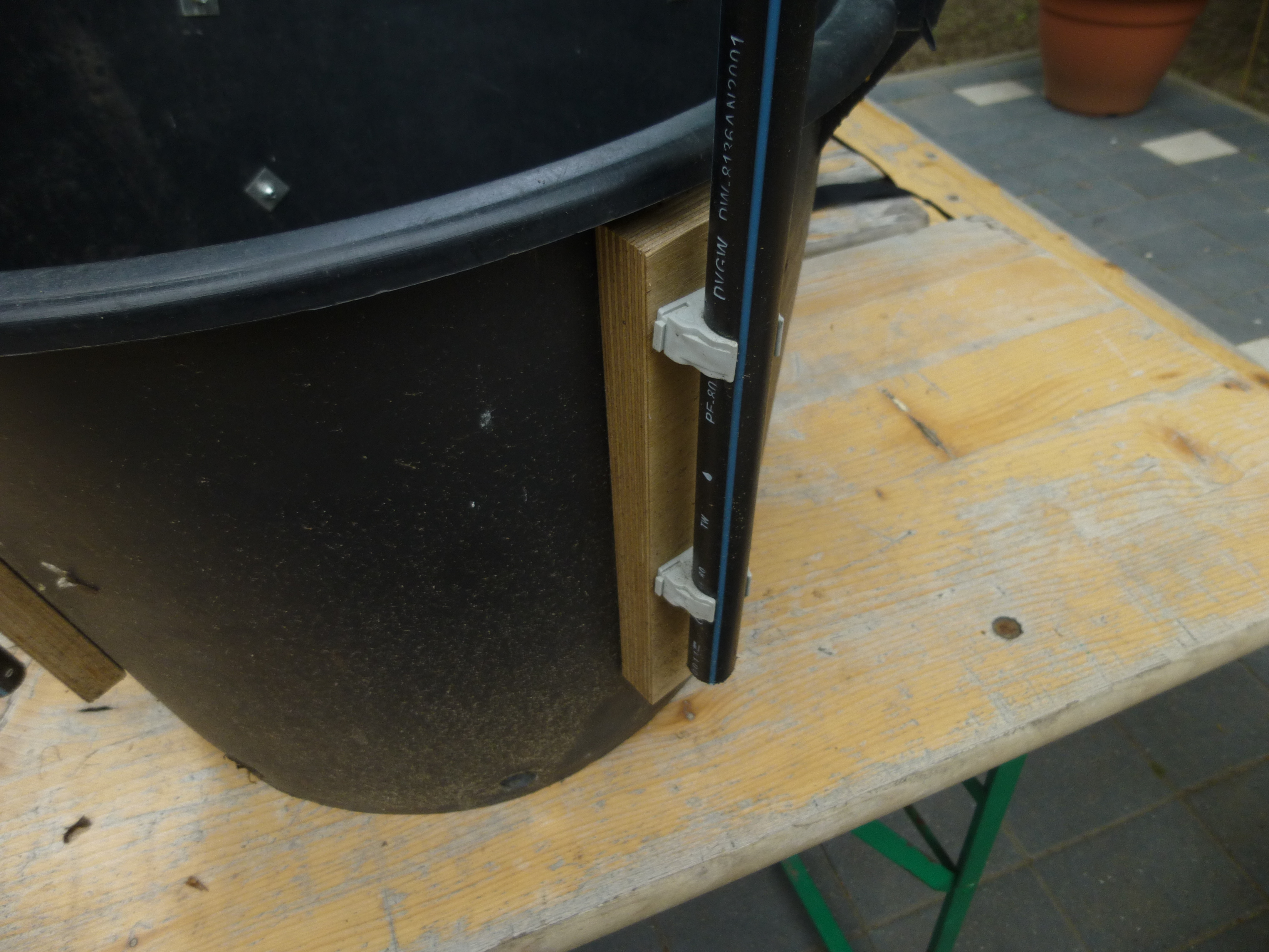 - Danach haben wir Holzblöcke an die Eimer geklebt um sie anschließend mit Bohrlöchern zu befestigen. Auf diese haben wir die Klammern mit Schrauben befestigt. An diese Klammern kamen nun die Schläuche.